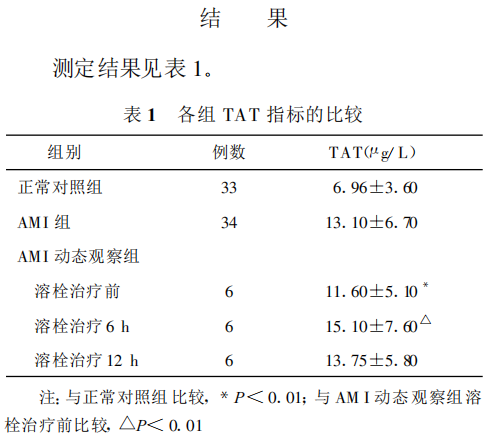 對臨床確診的34 例 AMI 患者和33 名正常對照者, 采用 ELISA 法檢測血漿凝血酶抗凝血酶複合物(TAT), 對其中6 名患者溶栓前、溶栓6 h 及溶栓12 h 血漿TAT 進行動態觀察並與正常對照組進行比較。