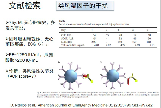 類風濕因子是針對免疫球蛋白G的自身抗體,其對肌鈣蛋白測定的影響類似於嗜異性抗體,可以導致肌鈣蛋白的假陽性升高。據報道約1%肌鈣蛋白升高的患者是單純地由於類風濕因子升高導致的。上麵第二個病例因患者無動物及疫苗接觸史,因此排除了嗜異性抗體的影響,而考慮類風濕因子對肌鈣蛋白測定的影響。