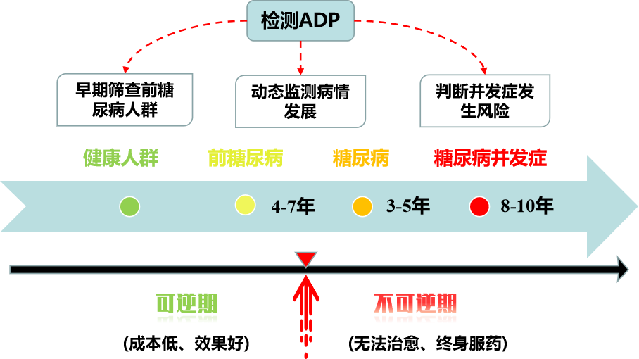 脂聯素可提前4-7年篩查出處於前糖尿病期(可能血糖指標正常)的高風險人群。在前糖尿病期(糖尿病自然病程的可逆階段),通過改變生活方式,例如改善飲食和體育鍛煉,可有效防控糖尿病的發生,實現2型糖尿病的一級預防。