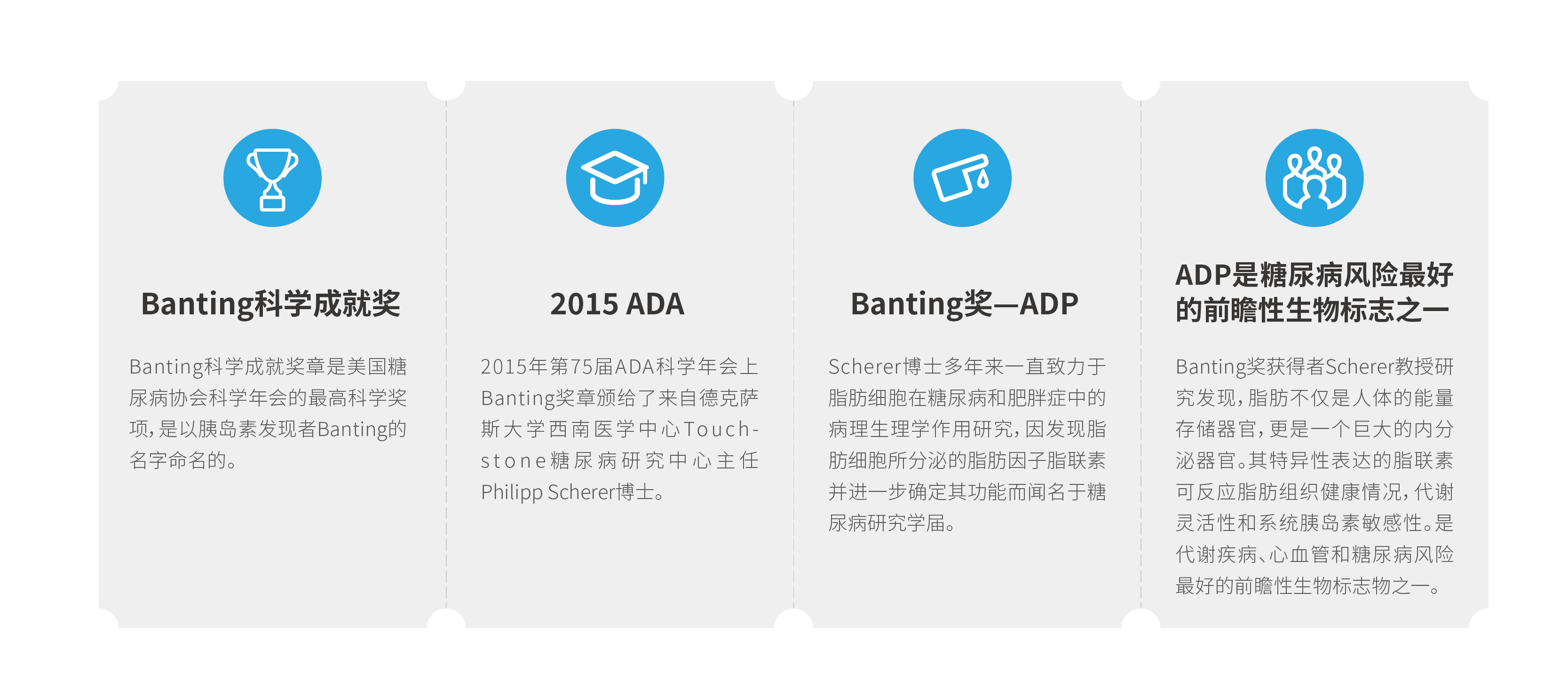 脂聯素(Adiponectin,ADP) 是由脂肪細胞分泌的、對人體有保護作用的特異性脂肪因子,人脂聯素由244個氨基酸組成,是一種血漿含量相對豐富的蛋白,其基因位於染色體3q27,這也是糖尿病易感基因所在處。脂聯素具有調節糖脂代謝,抗炎症反應,抗動脈粥樣硬化等生理功能。世界多項著名前瞻性研究列隊都得出一致結論,脂聯素水平越低,患糖尿病的風險越高。ADP是糖尿病風險最好的前瞻性生物標誌之一。