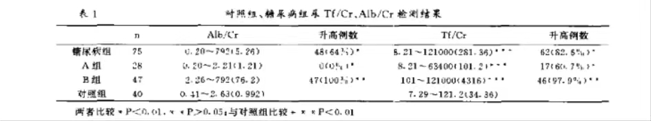 研究結果表明:糖尿病患者尿 Tf/cr 異常增加,在反應糖尿病腎損害中 Ab/cr 更為敏感,尿 Tf/cr 有望成為糖尿病腎病