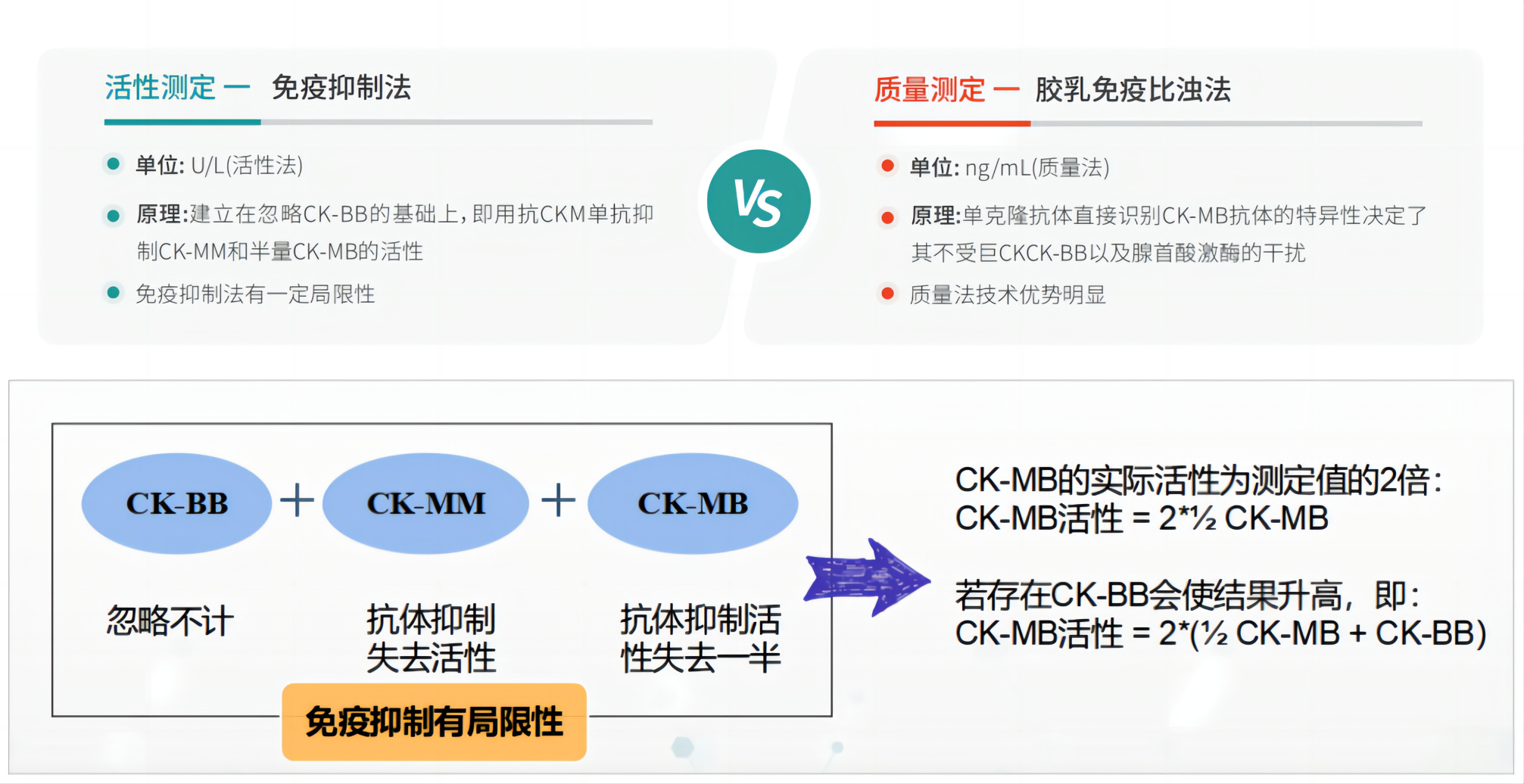 肌酸激酶(CK檢測有2種方法(活性法和質量法)。目前全國約有一半的實驗室使用活性法(免疫抑製法)來檢測CKMB,但活性法常受多種幹擾因素的影響,導致部分結果不準確。而質量法相比活性法優勢明顯,不僅敏感度高、特異性高,且不受CKBB、巨CK以及腺甘酸激酶的幹擾。