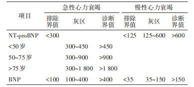 注:NTproBNP為N末端B型利鈉肽前體;肥胖患者(BMI≥30kg/m2 )NTproBNP診斷界值應降低50%;房顫患者NTproBNP診斷界值應提高 20%~30%;腎功能不全[估算腎小球濾過率(eGFR)<60 ml·min-1 ·(1.73m2 )-1 ]患者,NTproBNP 診斷心衰界值應>1200 ng/L。