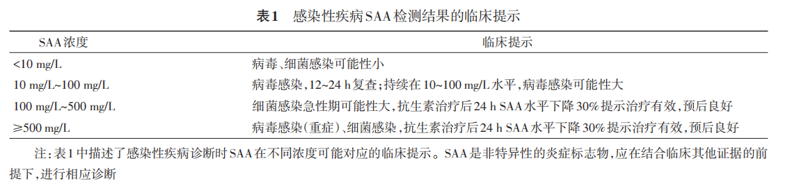 SAA水平持續高於10mg/L且低於100 mg/L,病毒感染可能性大;SAA在細菌感染急性期的水平持續高於100 mg/L,對於席卷感染急性期具有較強的提示性作用。
