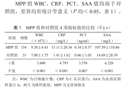 實驗采用:154例MPP組患兒中,男94例,女60例,平均年齡(4.6±3.1)歲;對照組51例患兒中,男31例,女20例,平均年齡(3.9±3.0)歲。2組性別、年齡比較差異無統計學意義(P=0.974、0.158)。
