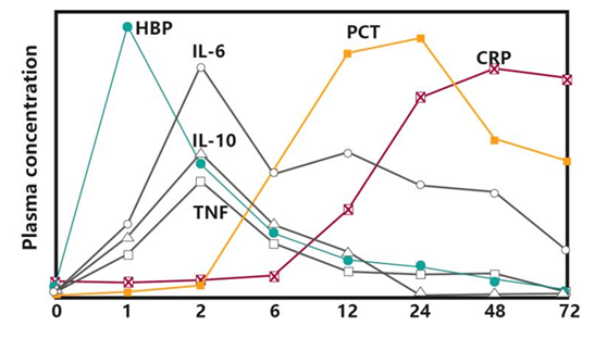 歐洲多中心研究發現,在膿毒症發生前72h即可在患者體內測得HBP濃度增加;在膿毒症發生前10.5h,大部分患者出現HBP濃度增加。與其它生物標誌物相比,HBP是發生器官功能障礙的最佳預測指標。