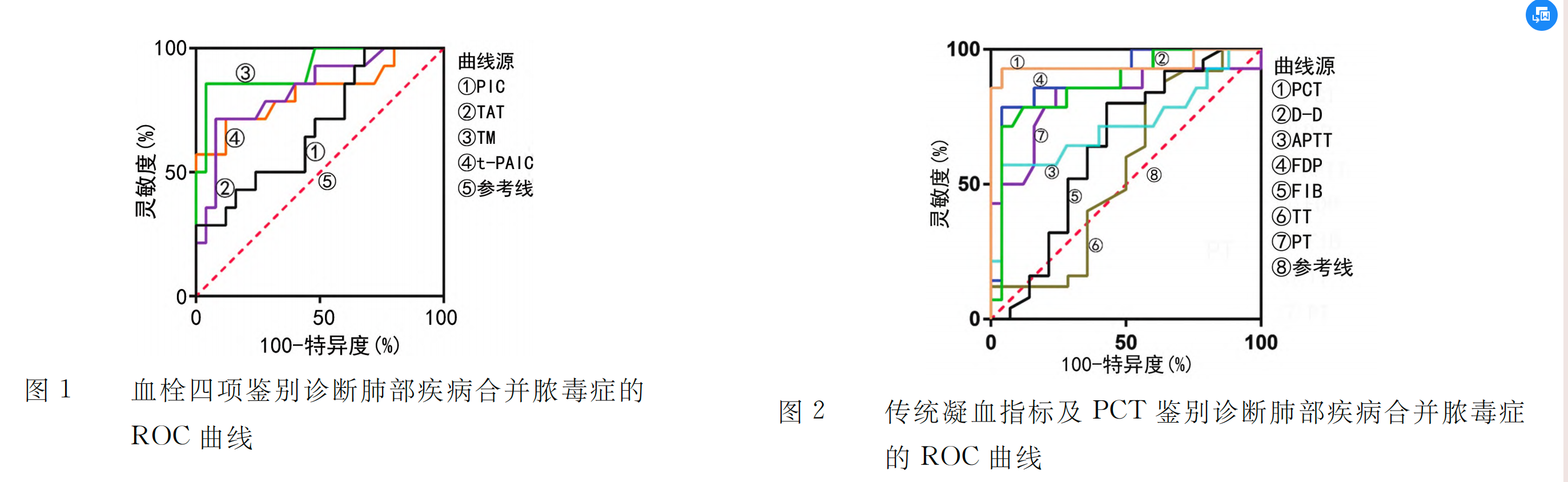 本研究ROC曲線分析結果顯示,TM、TAT、PIC及t-PAIC對兩種 疾病的鑒別診斷均有一定的效能,其中TM的AUC為0.9200,診斷效能 最高,PIC的診斷效能最低。