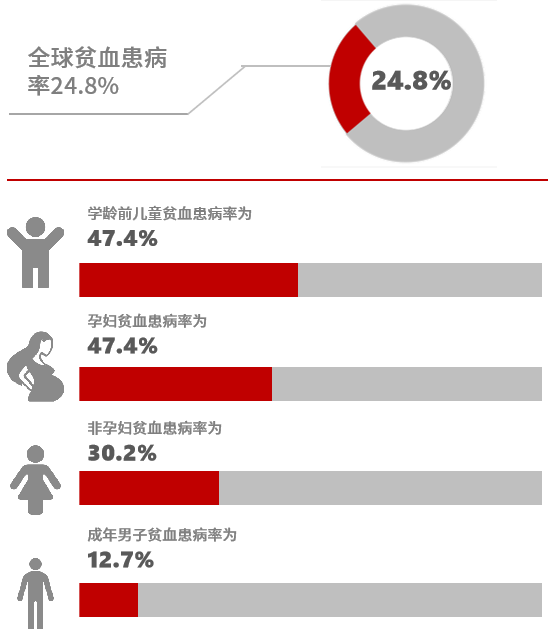 從貧血的流行病學角度而言,顯示近年貧血患者全球約有16.2億人,相當於全球人口的24.8%。