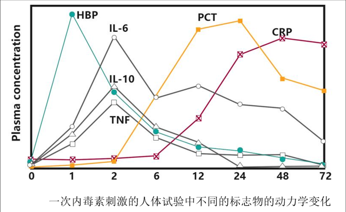 膿毒症是一種全身性感染炎症反應,在嚴重的情況下,它會導致組織灌注不足、缺氧、乳酸酸中毒和器官功能障礙。傳統的“金標準”細菌培養的結果回報時間長,而像C 反應蛋白(C-reactiveprotein,CRP)、降鈣素原(procalcitonin,PCT)等雖然具有一定的敏感度和特異度,但它們卻是評估預後較好的指標,所以急需一項更加敏感和特異的檢驗指標來預測、診斷膿毒症。膿毒症出現典型臨床症狀前HBP已經升高,HBP可作為嚴重膿毒症早期診斷的預測指標。