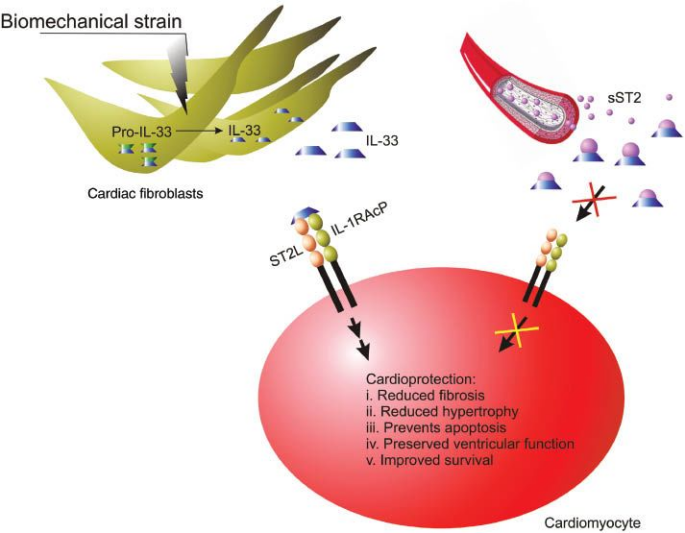 ST2L與功能配體IL-33結合對心髒具有保護作用,而血液中sST2含量升高,能夠競爭性結合IL-33,阻斷IL-33/ST2L信號通路,從而抑製ST2對心髒的保護作用,使心肌受累,心髒結構與功能受影響,增加了疾病的發展率。因此,當心力衰竭發生時心髒由於受到機械牽張作用,sST2水平明顯升高,進而增加對心髒的損傷作用。