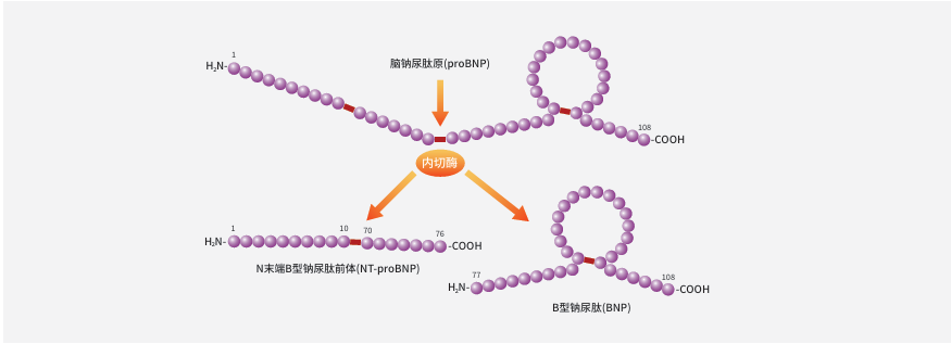 NT-proBNP又稱B型氨基端利鈉肽原,人心肌細胞首先合成含108個氨基酸的B型鈉尿肽原(proBNP),之後在內切酶的作用下被切割為含76個氨基酸的N末端B型鈉尿肽原(即B型氨基端尿鈉肽原)和含32個氨基酸的C端多肽BNP。
