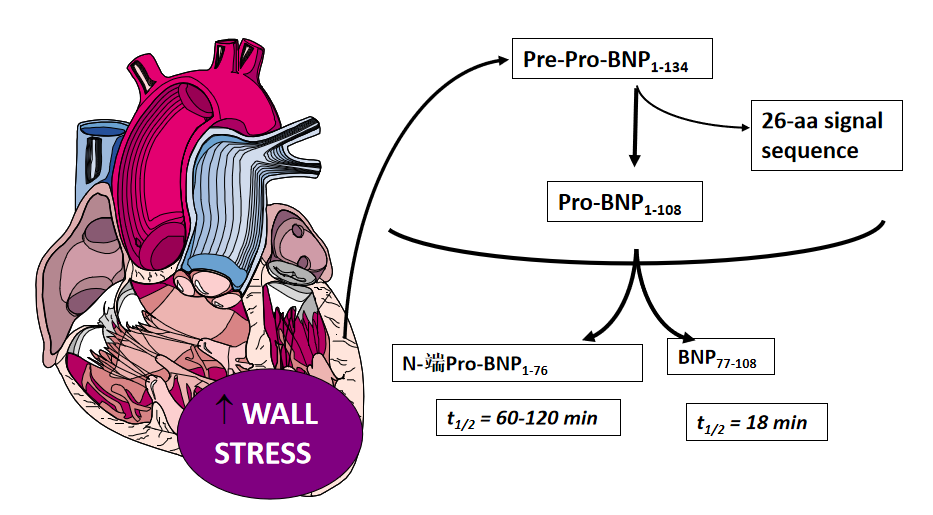 NT-proBNP是一個很好的反映心功能的指標,它對診斷慢性充血性心力衰竭(心衰)具有高度的敏感性、特異性,在2001年已被列入歐洲心髒病協會最新製定的心力衰竭指南中。BNP主要由心室合成,最初合成為含134個氨基酸的prepro-BNP,之後切去N端26個氨基酸的信號肽成為含108個氨基酸的proBNP,再進一步被內肽酶切割,成為含N端76個氨基酸的NT-proBNP和含C端32個氨基酸的BNP,釋放人血。由於 NT-proBNP與BNP是等摩爾釋放,因此二者在心血管係統疾病的診斷、治療監測和預後方麵有著相似的臨床應用。