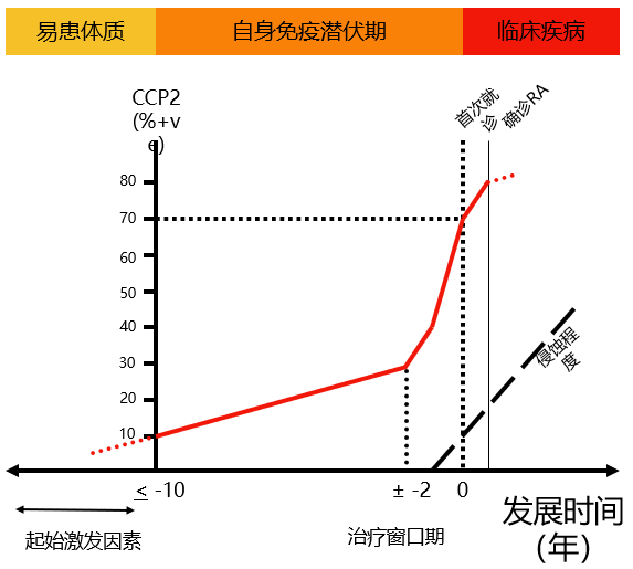 RA患者發病前10年即可檢測出抗CCP抗體,有助於RA的早期診斷。